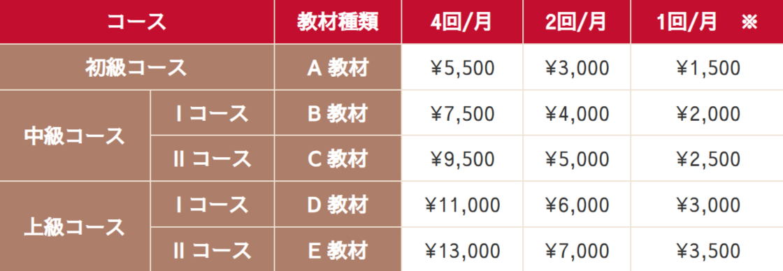 | コース | 教材種類 | 4回/月 | 2回/月 | 1回/月 ※ | |