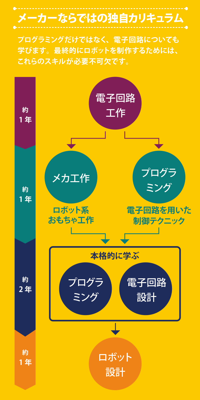 電子回路制作・プログラミング・ロボット制作を一貫した流れで多種多様な実習・実験を通じ、ものづくりを習得いたします。