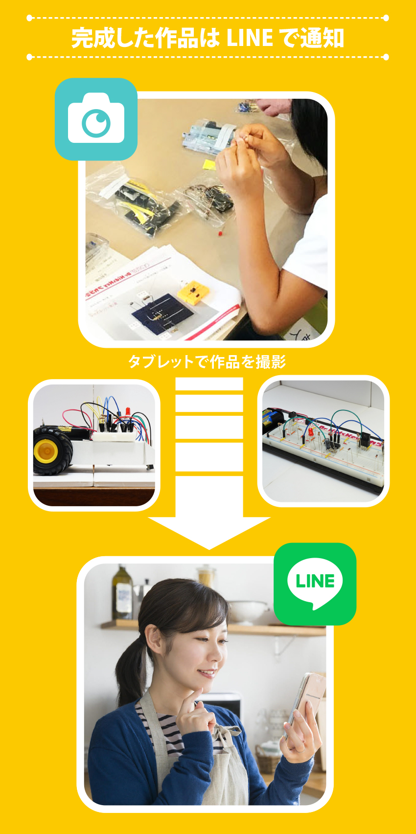 ものづくりDr. KidsKeyアカデミー公式Facebook・LINEを活用することで、保護者はいつでも子供達の進捗状況や子供たちが製作した成果物を確認することができ、また、クラスや講師へのコメントを書き込むことができます。子供たちが教室に到着したときや、帰るときには自動的に通知されるので、安心して子供たちを送り出すことが出来ます。